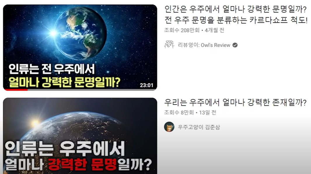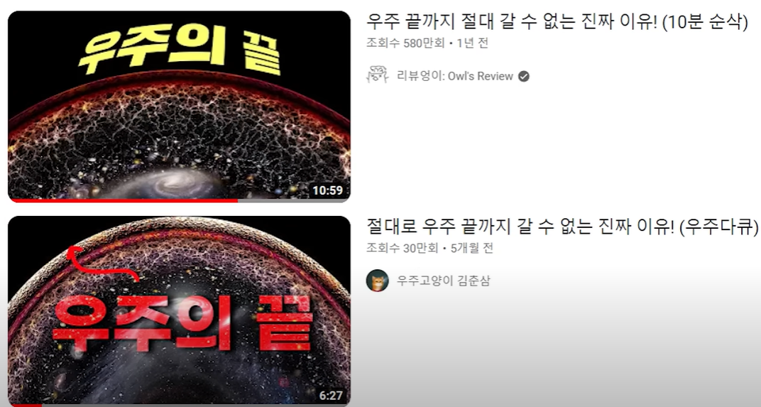 우주의 끝, 우주 최강의 천체 보이시나요 제목이? 똑같이 따라 했습니다. 이건 수정이라고 변명하기도 힘들어 보입니다. 이것 뿐만이 아닙니다. 이런 완전 똑같은 영상은 엄청 나게 많습니다. 아래는 또다른 사진입니다.